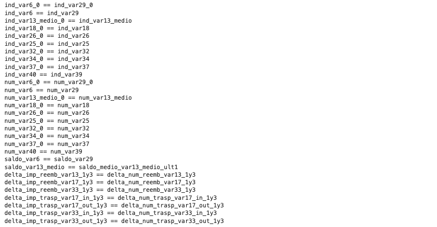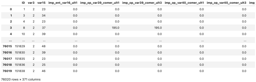 Santander Customer Satisfaction data는 아래 사진과 같이 모든 feature가 개인정보를 이유로 feature의 이름이 모두 익명처리 되어있다.