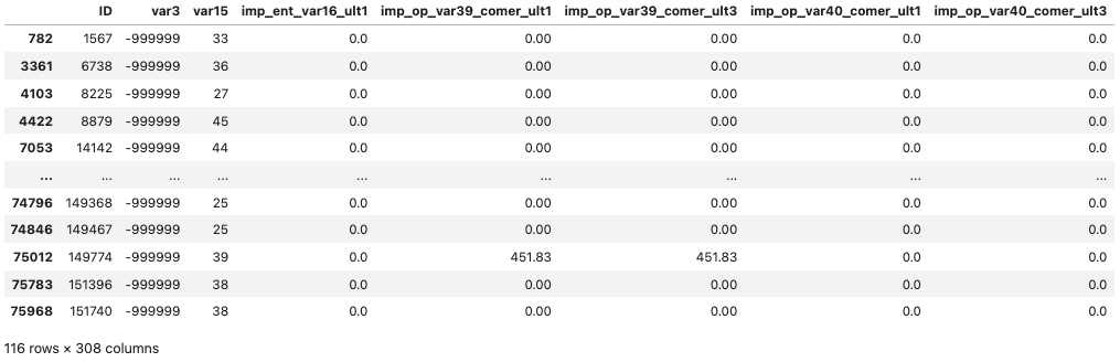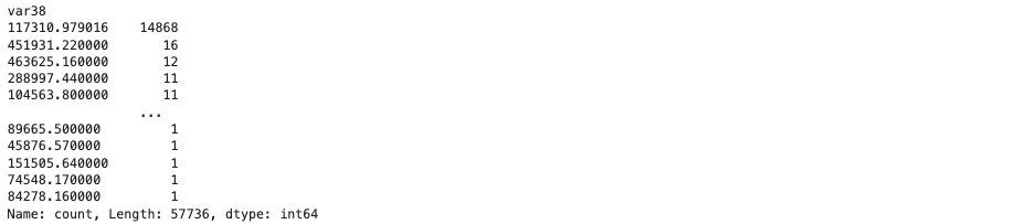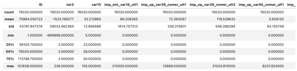 출력된 내용을 보면 이상한 부분이 var3이다. var3의 경우 min 값이 -999999로 나온다. var3이 무엇인지는 몰라도 -999999는 충분히 의심할 수 있는 값이다. 아마 NaN인 값을 -999999로 대체했을 가능성이 있다. 따라서 var3과 같이 이상치가 있는 컬럼이 더 존재할 수 있기 때문에 확인이 필요하다.
