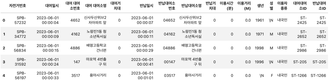 - 2023년 06-12까지의 서울시 공공 자전거 데이터셋(분 단위)