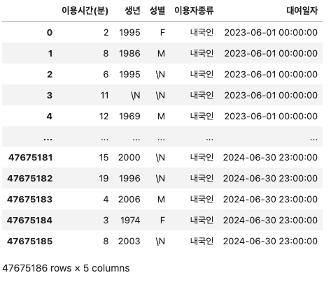 - 2024년 01-06까지의 서울시 공공 자전거 데이터셋(분 단위)