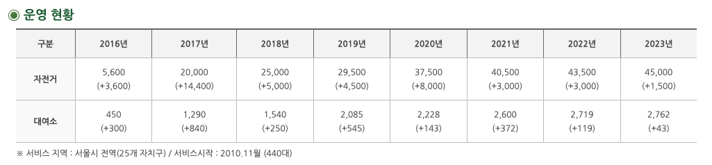 서울특별시에서 운영 중인 공공 자전거와 대여소는 매년 증가하고 있지만, 이용 건수는 2023년까지는 증가 추세를 보였으나, 민간 전동 이동 수단의 대중화로 인해 2024년부터는 감소하는 경향이 나타나고 있다.