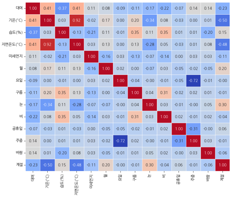 변수 간의 연관성이나 상관성을 측정하기 위해 상관관계를 계산한 후 히트맵을 그려보려고 한다. 그래프 26을 보면 기온의 경우 지면온도와 상관관계가 매우 높기 때문에 제거하는 것도 고려해 볼 수 있다. 년과 월, 요일과 주중의 경우 음의 상관관계가 높다. 년의 경우 2023, 2024만 있기 역시 제거하는 것도 고려해 볼 필요가 있으며 이후 모델을 통해 예측할 때 확인해보고자 한다.