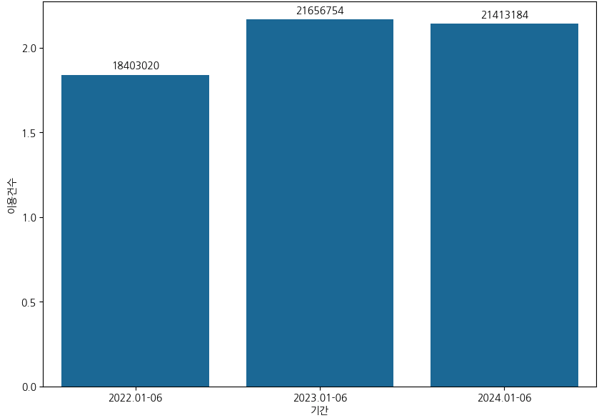 그러나 최근 들어 공공 자전거 이용 건수가 점차 감소하고 있으며, 그래프 2에서 볼 수 있듯이 자전거와 대여소의 수는 증가하고 있지만, 대여 건수는 오히려 줄어들고 있다. 이러한 현상이 지속될 경우 여러 가지 부정적인 영향을 초래할 수 있다.
