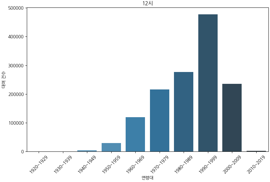 그래프 23을 보면 자전거 대여 건수가 가장 많은 8시, 18시 즉, 출퇴근 시간대에 가장 많이 이용하는 연령대는 1990~1999년, 1980~1989, 1970~1979년 생인 직장인이 가장 많이 이용하는 것을 알 수 있다. 반면 출퇴근 시간 외에 사용자가 증가하는 시간대인 15시 17시를 보면 그래프24와 같다. 2000~2009년 생이 출퇴근 시간과 다르게 이용객이 많이 증가한 것을 확인할 수 있다. 그리고 출퇴근 시간, 15시, 17시를 제외하고 대여 건수가 많았던 12시를 보면 아래에 있는 그래프25과 같다. 예상과 반대로 학생이 아닌 직장인이 더 많이 이용하고 있다는 것을 확인할 수 있다.