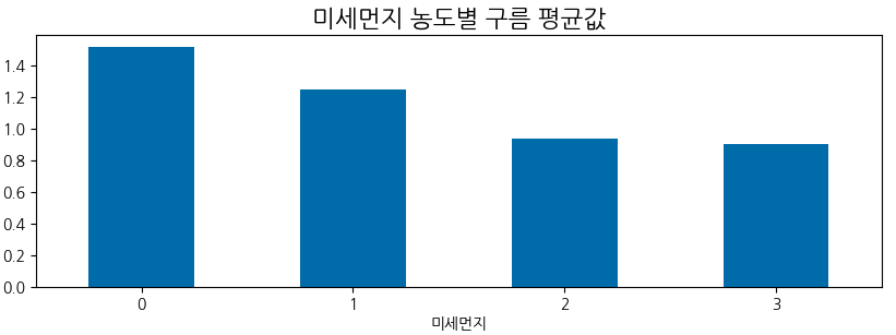 그래프19를 보면 미세먼지는 봄에 많이 있다. 앞에서 확인했듯 봄에 자전거 대여 건수가 많은 것을 확인할 수 있었으며, 그래프20을 보면 미세먼지가 많은 날에 구름이 없는 맑은 날씨, 대체로 맑은 날씨라는 것을 확인할 수 있다. 또한, 그래프21을 보면 흐린 날 보다는 맑거나, 대체로 맑음, 대체로 흐림인 날씨에 자전거 대여 건수가 많은 것을 확인할 수 있다. 즉, 많은 사람들이 봄, 여름, 가을에 구름이 없는 맑은 날을 미세먼지가 없는 날로 착각하고 자전거 대여하는 경우가 많다는 것을 확인할 수 있다.
