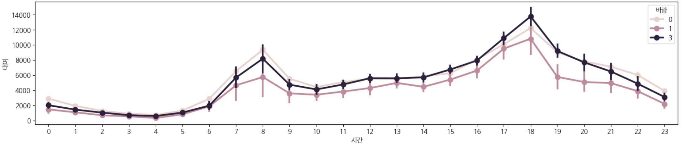 바람의 경우 약한 바람, 약간 강한 바람, 매우 강한 바람만 나타났다. 자전거 대여 건수가 출퇴근 시간에만 집중된 것이 아니라는 것을 확인할 수 있다. 또한, 바람의 세기에 따라 구분되는 것이 아닌 전체적으로 비슷한 대여 건수를 보여 준다. 특히, 매우 강한 바람이 불 때 대여 건수가 12시 이후부터 20시까지 가장 많은 것을 확인할 수 있다. 즉, 바람의 경우 많이 불거나 아예 불지 않을 때 가장 대여 건수가 가장 많다는 것을 알 수 있다.