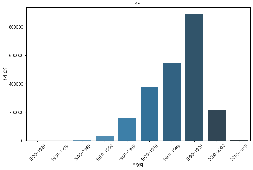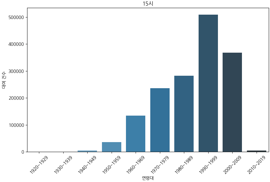 연령대를 구분해서 어느 연령대가 가장 공공 자전거를 대여를 많이하고 어느 시간에 가장 대여를 많이 하는지 확인해 볼 수 있다. 일반적으로 카드를 통해 비용을 지불하는 방법으로 미성년자인 학생보다는 직장을 다니거나 대학생의 경우 공공 자전거 대여를 많이 할 것으로 예상된다. 시각화를 통해 분석을 해보면 다음과 같다.