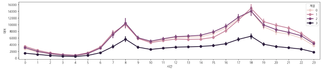 그래프16를 보면 눈의 경우 맑음(0), 적당한 눈(2), 강한 눈(3)만 나타난 것을 확인할 수 있다. 눈 역시 출퇴근 시간대에 대여 건수가 많은 것을 확인할 수 있으며, 눈이 많이 올 수록 대여 건수가 적다는 것을 알 수 있다. 눈의 경우 많이 올 경우 도로가 미끄러워져 자전거를 타기에 위험하다는 것과 비와 다르게 눈은 어느정도 맞아도 젖지 않기 때문에 공공 자전거 대여 건수가 낮다고 볼 수 있다.