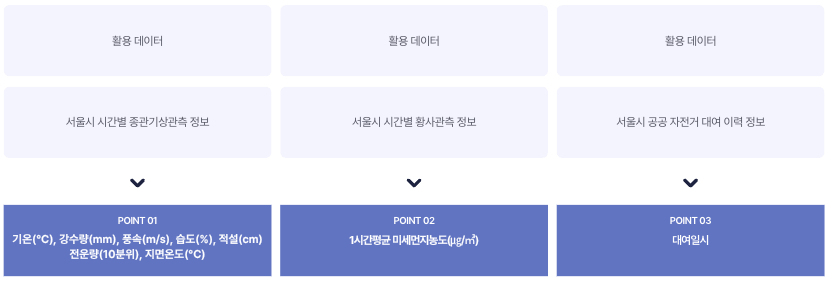 - 날씨, 이용자 정보, 이용 시간, 휴일 등 외부 요인이 공공 자전거 이용에 미치는 영향을 분석하여 이용 패턴을 파악하고, 이를 바탕으로 이용 활성화 방안을 도출
