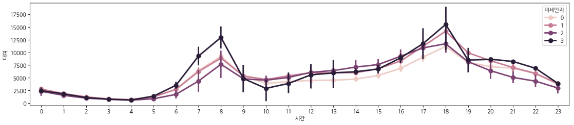 날씨 부분에서 주목할 점은 미세먼지이다. 그래프18을 보면 미세먼지가 많을 수록 자전거 대여 건수가 많은 것을 알 수 있다. 미세먼지가 없는 맑은 날씨가 대 건수가 가장 낮다는 것을 확인할 수 있다. 따라서 미세먼지와 다른 날씨와의 관계를 비교해볼 필요가 있다.