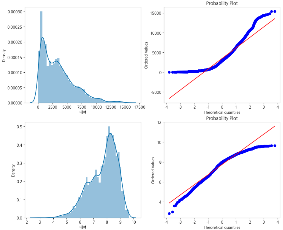그래프27을 보면 위의 그래프는 원본 데이터이다. 좌측 상단의 경우 대여 건수가 0~2000사이에 집중되어 있으며, 이후의 대여 건수는 감소하고 있는 것을 확인할 수 있다. 즉, 한 쪽으로 치우쳐진 불균형한 데이터인 것을 확인할 수 있다. 우측 상단의 그래프는 빨간 선이 이상적인 정규분포에 해당하는 직선일 때 대부분의 파란 선을 벗어나고 있다. 따라서 모델에 학습하기 전 로그변환과 같은 방법을 이용해 정규분포 형태로 변환하는 작업이 필요하다. 로그 변환 후의 모습은 아래 두 개의 그래프와 같다.