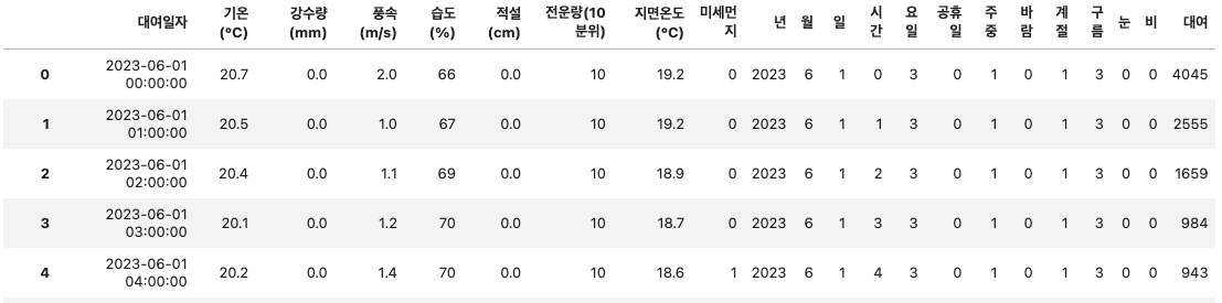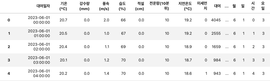 - '일시' column명을 '대여일자'로 수정한 후 대여일자를 기준으로 날씨 데이터셋과 황사 데이터셋 결합