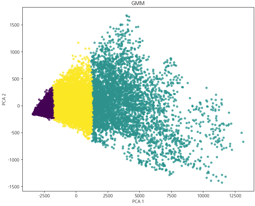 반면 오른쪽 그래프는 데이터가 한쪽으로 퍼져있으며 일부 데이터 포인트가 외곽에 위치하고 있다. 군집화는 이전과 같이 KMeans, GMM, DBSCAN을 이용했다.