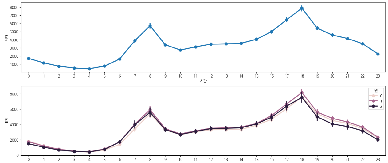 그래프1을 보면 여전히 출퇴근 시간에 가장 많이 공공 자전거를 대여했다는 것을 확인할 수 있다.