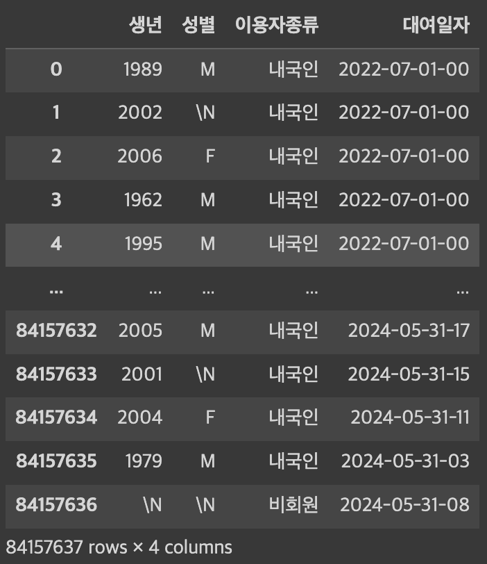 2022년 7월부터의 데이터를 이용한 이유는 서울시에서 공개한 2022년 7월 이전까지의 데이터는 성별, 나이와 같은 개인 정보에 해당하는 데이터가 없어서 연령대별 공공 자전거 수요를 파악하지 못 할 뿐만아니라 데이터의 구조가 2022년 7월부터 달라졌기 때문에 분석에서 제외하고 진행했다.