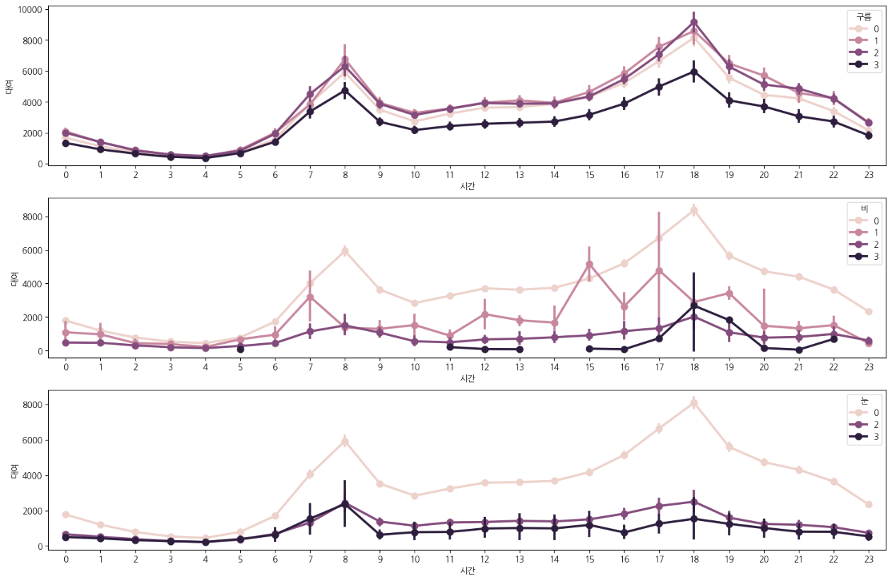 그래프4를 보면 구름의 경우 맑음인 0보다 대체로 맑음인 1, 대체로 흐림인 2일 때 대여 건수가 많은 것을 알 수 있다. 즉, 맑은 날씨에 공공 자전거 대여가 줄어 든 것 역시 기존과 같다. 또한, 비의 경우 맑은 날씨(0)에 가장 대여 건수 많으며, 약한 비(1)가 내릴 때 그래프의 높낮이가 특정 시간 대에 계속 변화하는 것을 확인할 수 있다. 약한 비가 올 때는 다른 날씨와 다르게 출퇴근 시간 이외에 12시, 15시, 17시에 대여 건수가 증가하는 것을 확인할 수 있다. 공공 자전거의 경우 만 13세 이상이면 누구나 이용이 가능하다. 15시의 경우 중학생의 하교 시간이며, 17시의 경우 고등학생의 하교 시간이다. 따라서 약한 비가 올 때는 학생들의 하교 시간에 맞춰서 증가한다고 추측할 수 있다. 특히, 주목할 점은 강한 비가 내리는 날에 퇴근 시간에 급격하게 증가한 모습을 볼 수 있다. 즉, 우산이 없는 직장인의 경우 빠르게 집에 가기 위해 공공 자전거를 타고 급하게 집으로 가는 것이라 추측할 수 있다. 추측에 대한 근거는 아래 그래프5, 6, 7, 8를 통해 확인할 수 있다.