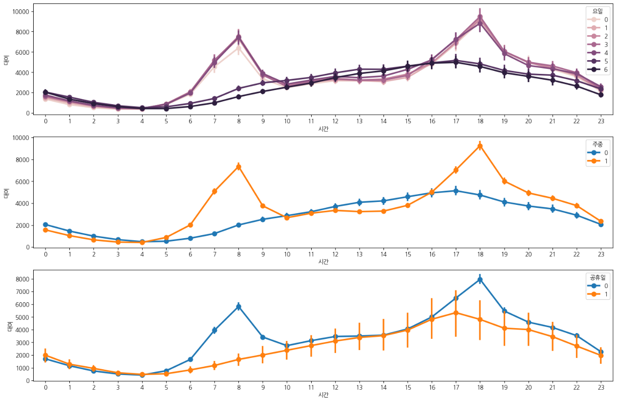 뿐만 아니라 그래프2에서도 이전과 같이 0~4인 월, 화, 수, 목, 금에 출퇴근 시간에 대여 건수가 많이 있다. 5~6인 주말에는 점심 이후 저녁 전까지 증가하다가 감소하는 것을 확인할 수 있다. 공휴일과 공휴일이 아닌 경우에도 같은 양상을 보여준다는 것 또한 확인할 수 있다.