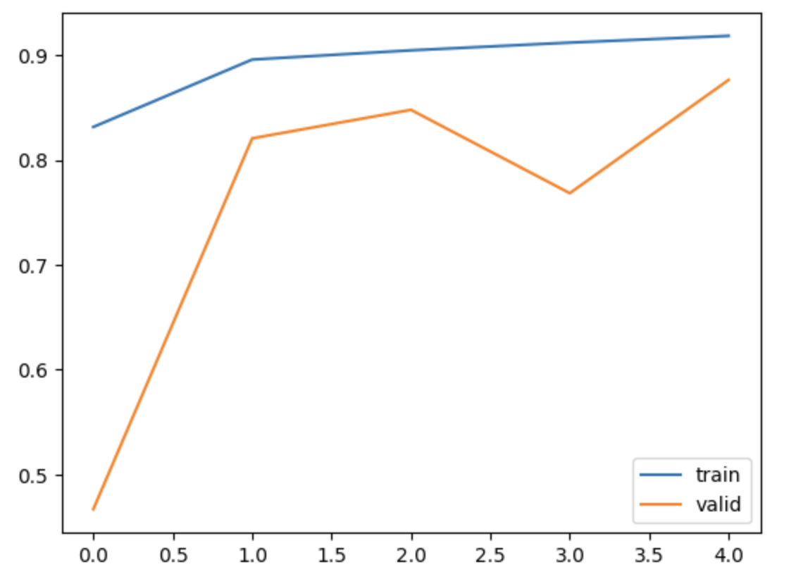 이전에 했던 모델들과 같이 데이터 증강 기법을 적용하지 않고 learning_rate는 0.001로 진행했다. ReduceLROnPlateau과 EarlyStopping을 각각 patience=3, patience=5 적용했기에 총 30 epoch 중 5번 째 epoch가 완료된 후 early 조기 종료(Early Stopping)가 적용되어 학습이 중단되었다. 훈련 결과와 그래프를 통해서 봤을 때 resnet50은 모델이 학습 초기에는 훈련 데이터와 검증 데이터 모두에 대해 적절히 학습하고 있지만, 중반 이후부터는 검증 데이터에 대한 성능이 불안정해지고 있다. 하지만 검증 성능에서 중간에 일시적으로 감소했다가 다시 상승하는 변동이 있다. 이러한 변동은 일반적으로 데이터가 복잡하거나 학습이 불안정할 때 발생할 수 있다.