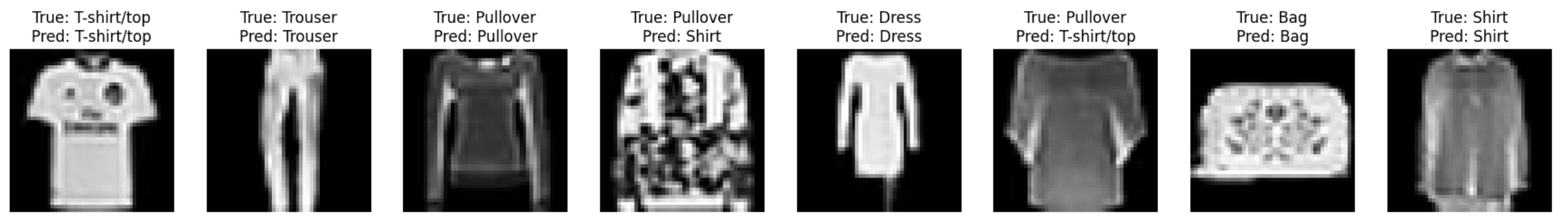 직접 설계한 모델들 중 make_model2는 훈련과 검증 세트에서 안정적인 성능을 보이며, 테스트 데이터에서도 비교적 우수한 예측 성능을 보였다. 이는 모델이 학습과 검증 과정에서 과적합을 방지하며, 일반화 성능을 어느 정도 유지할 수 있었기 때문이다. 특히 데이터 증강 없이 학습을 진행했음에도 높은 성능을 보여, 패션 MNIST와 같은 단순 구조의 데이터에서는 적절히 설계된 소형 CNN 모델이 강력한 성능을 발휘할 수 있음을 확인할 수 있었다.