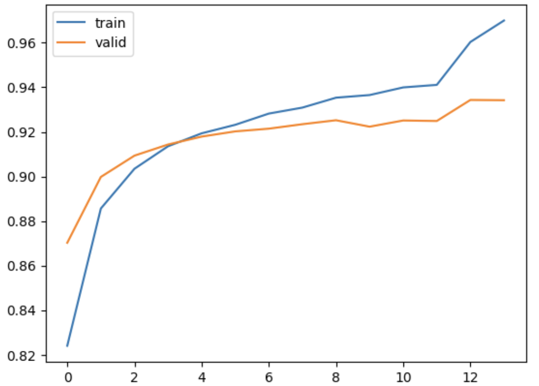 이전에 했던 모델들과 같이 데이터 증강 기법을 적용하지 않고 learning_rate는 0.001로 진행했다. ReduceLROnPlateau과 EarlyStopping을 각각 patience=3, patience=5 적용했기에 총 30 epoch 중 13번 째 epoch가 완료된 후 early 조기 종료(Early Stopping)가 적용되어 학습이 중단되었다. 훈련 결과와 그래프를 통해서 봤을 때 vgg16은 훈련 성능 에포크가 진행됨에 따라 꾸준히 증가하고 있으며, 거의 100%에 근접. 이는 모델이 훈련 데이터를 잘 학습하고 있다는 것을 의미한다. 검증 성능에서는 초기 에포크 동안 급격히 증가하다가, 중반 이후에는 상승세가 완만해지고 비교적 일정하게 유지되고 있다. 즉, 훈련 데이터에 대해 높은 정확도를 보이지만, 검증 데이터에서는 성능 향상이 제한되며, 과적합 가능성이 있다.