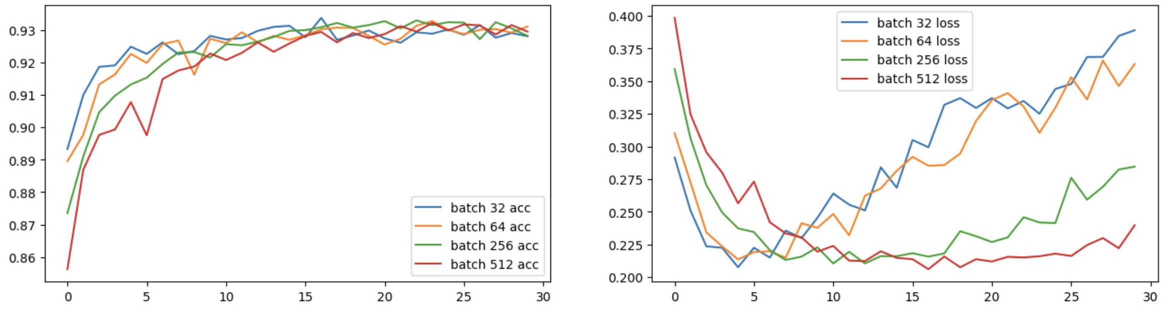 - 후반 에포크: 배치 크기 32와 64는 높은 훈련 정확도를 유지하며, 거의 93% 이상의 성능에 도달했다. 반면, 배치 크기 256과 512는 최종 정확도가 낮거나 약간의 불안정성을 보이고 있다.