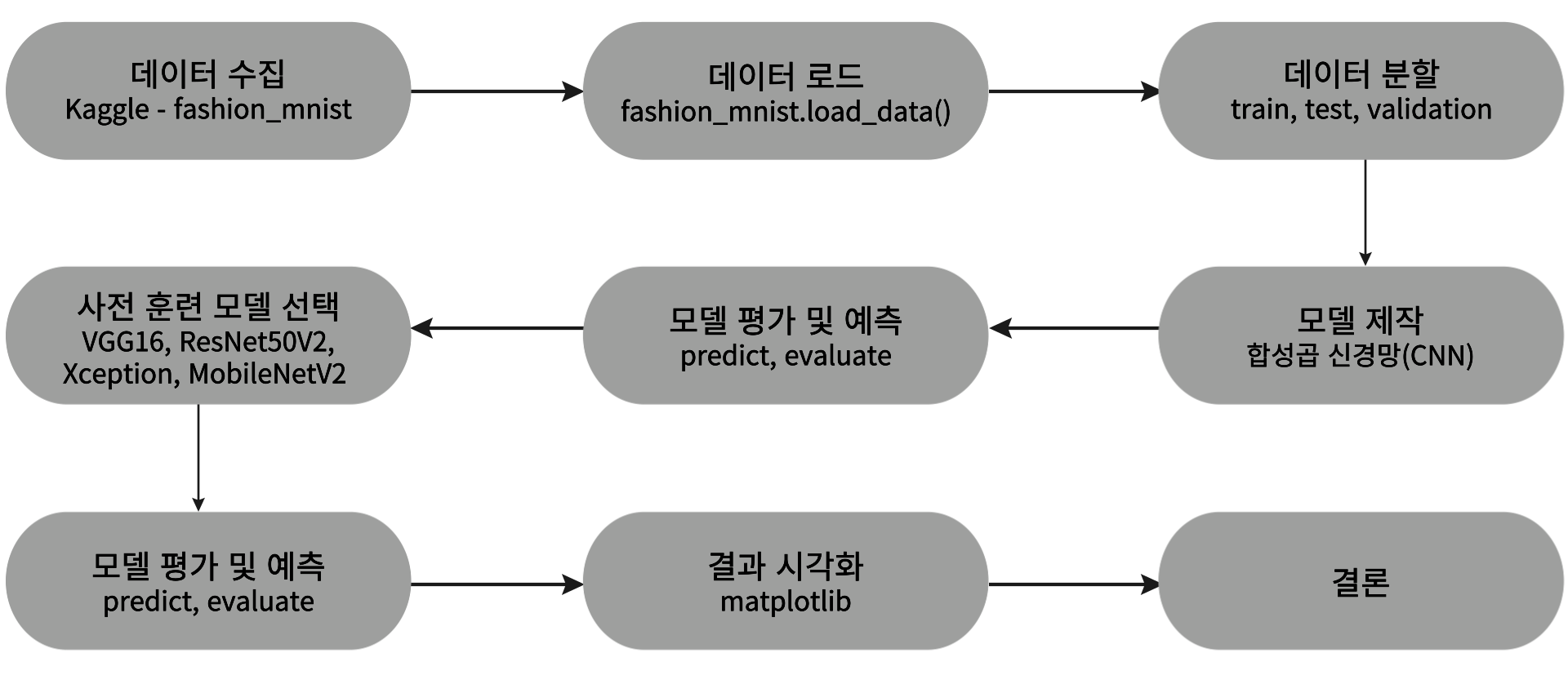 사전 훈련된 모델들은 패션 MNIST 이미지의 특성을 고려하여 IMAGE_SIZE를 48x48로 확장하고, 채널을 1에서 3으로 조정해야만 사용할 수 있었다. 이러한 조정은 모델이 학습 과정에서 좋은 성능을 보이도록 해주었으나, 실제 테스트 세트에서는 예측 오류가 높아 훈련 및 검증과 테스트 간의 성능 차이가 발생하는 과적합 문제를 보였다. 이는 사전 훈련된 모델이 단순히 이미지 크기와 채널을 확장하는 것만으로는 패션 MNIST의 특성에 적절히 적응하지 못하고 있음을 시사한다.