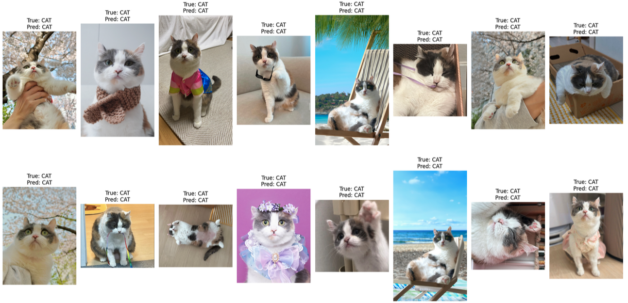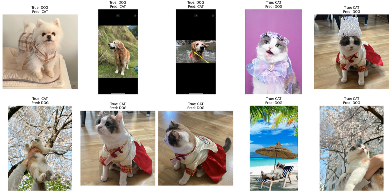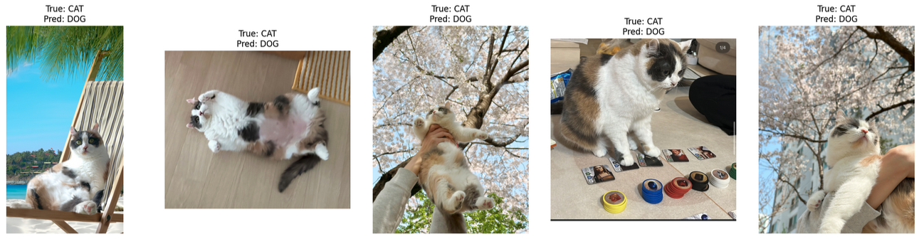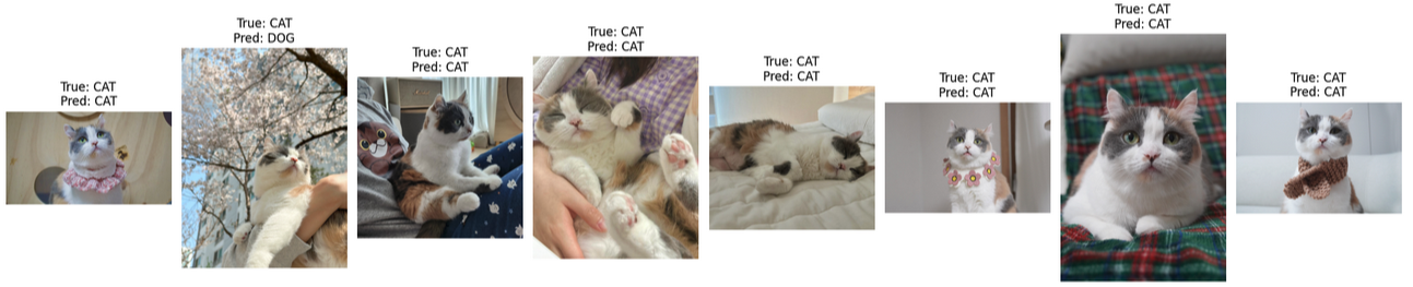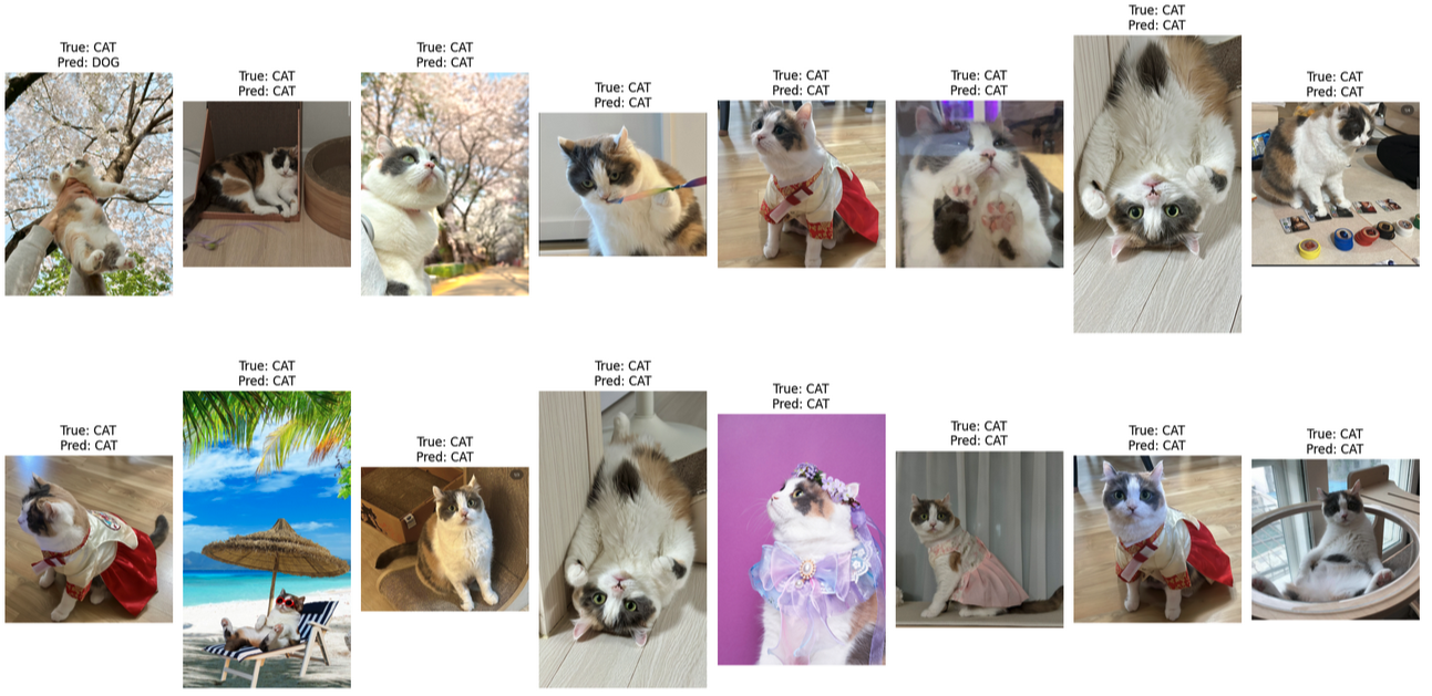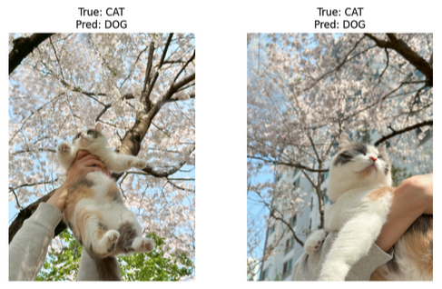 - 다만, 직접 수집한 추가적인 강아지와 고양이 이미지에서 모든 모델이 공통적으로 예측에 실패한 사례가 있었다. 특히, 고양이의 얼굴이나 귀가 가려진 이미지에서 예측이 어려웠다. 이는 모델이 특정한 특징(귀 모양, 얼굴 윤곽 등)을 통해 고양이를 인식하고 있음을 의미하며, 이러한 부분에서 예측 정확도를 높이기 위해 추가적인 데이터 증강이나 전처리 기법을 적용할 필요가 있다.