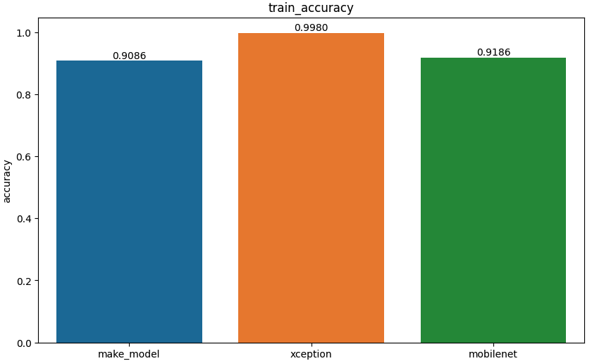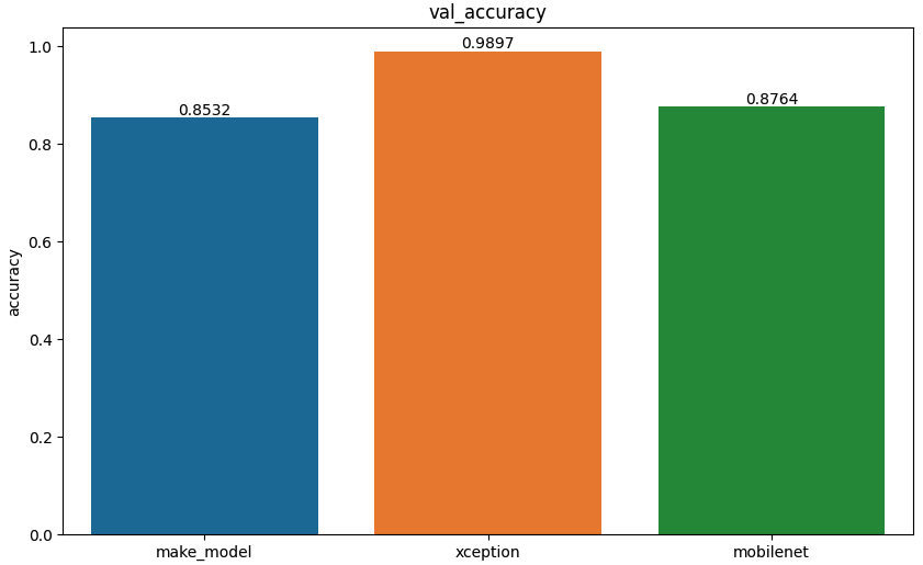 직접 만든 모델과 사전 훈련된 모델 2개를 이용해서 훈련을 진행했다. 훈련 성능에서 사전 훈련 모델인 Xception 모델은 98.97%에 도달하며 훈련 데이터에 매우 잘 맞추고 있다. 뿐만 아니라 검증 성능에서도 Xception 모델이 0.9897로 가장 높은 검증 정확도를 보여주었으며, 검증 손실에서는 Xception 모델이 가장 낮은 검증 손실을 보여준다. 각각 모델이 test 데이터셋을 통해 검증을 했을 때 점수는 아래 표와 같다.