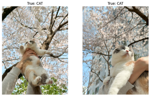 모든 모델이 공통적으로 예측에 실패한 사진이 두 개가 있다. 아래 그림9로 모두 고양이 사진이다. 사람의 입장에서 쉽게 고양이로 구분할 수 있지만 두 사진은 고양이의 얼굴이나 귀 부분이 약간 가려져 있거나 분명하지 않아 모델이 고양이를 식별하는 데 사용하는 특징이 덜 보일 수 있다. 모델은 일반적으로 귀의 형태나 얼굴의 특정 특징을 통해 고양이와 강아지를 구분하는 경우가 많기 때문에, 이런 특징이 모호하면 잘못된 예측을 할 가능성이 있다.