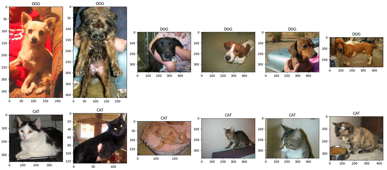 이미지는 앞에서 확인했 듯 훈련 세트 30,028, 검증 세트 12,500, 테스트 세트 12,500개로 구성되어 있다. 훈련 세트 이미지를 강아지, 고양이 각각을 확인하면 아래와 같다.