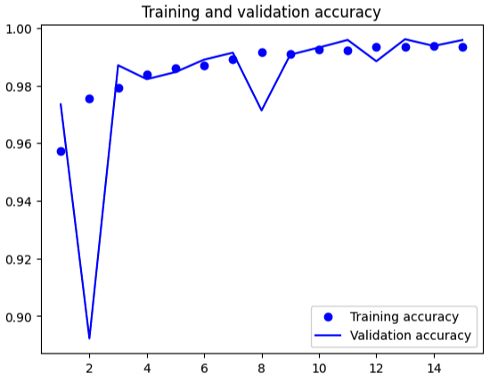 학습 정확도와 검증 정확도가 높은 수준으로 수렴하고 있다. 학습 초기부터 높은 정확도를 보이며, 에포크가 진행될수록 안정화되는 모습을 보여준다. 또한, 학습과 검증 정확도의 차이가 거의 없어, 모델이 학습 데이터에 과적합되지 않고 일반화 성능이 매우 좋다고 볼 수 있다. 하지만 특정 에포크에서는 검증 정확도에 약간의 변동이 있지만, 전체적으로는 높은 정확도를 유지하며 안정적인 성능을 나타내고 있다.