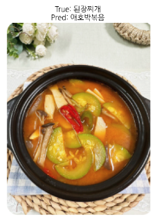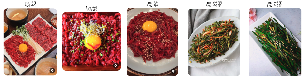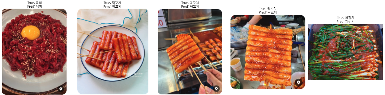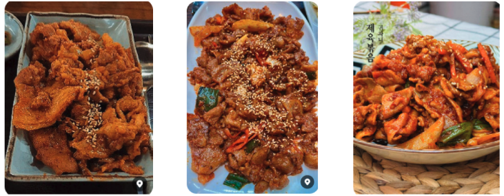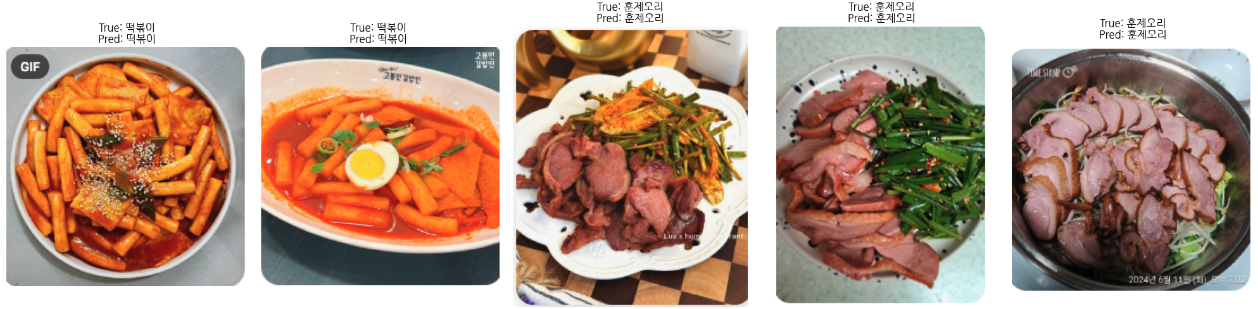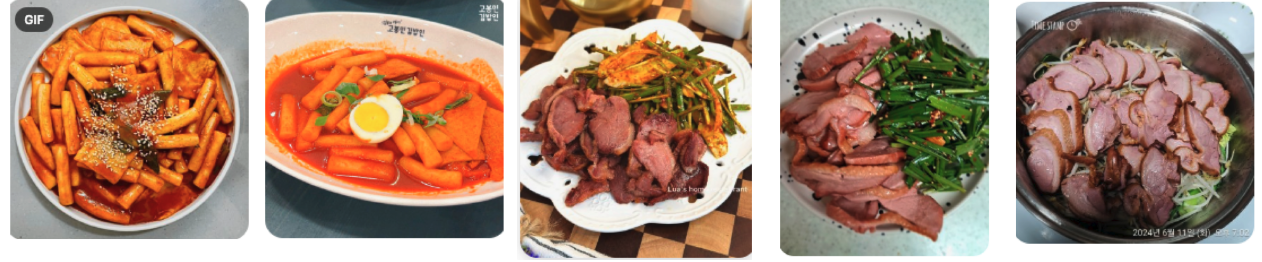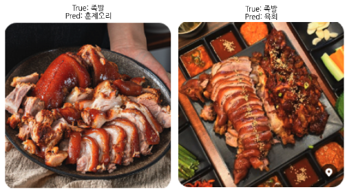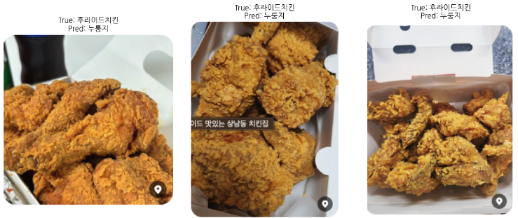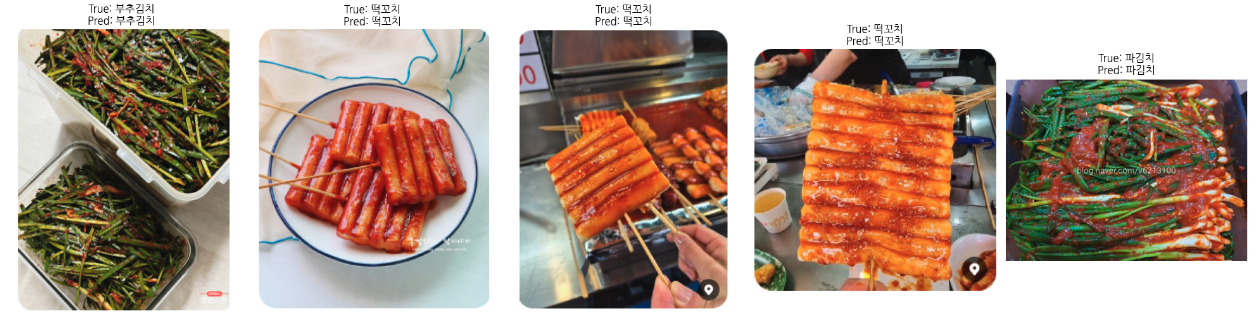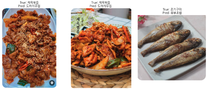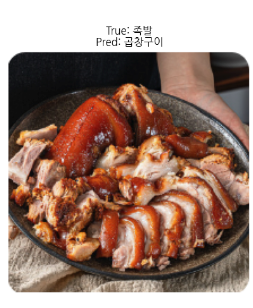 뿐만 아니라 직접 수집한 이미지를 기반으로 예측을 진행했을 때 정확도가 69.70%가 나왔다. 직접 수집한 이미지는 '제육볶음', '조기구이', '콩나물국', '떡볶이', '훈제오리', '후라이드치킨', '육회', '떡꼬치', '파김치', '족발', '된장찌개' 총 11개의 소분류로 구성되어 있으며 각각 세 장의 이미지를 수집해 총 33장의 이미지를 예측에 사용했다. 아래의 사진은 예측에 실패한 음식 사진이다.