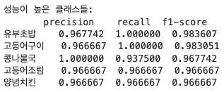 추가적으로 EfficientNetB3의 미세 조정2의 성능을 시험해보기 위해 소분류 음식 9종을 추가해 총 60장의 음식 이미지를 대상으로 예측을 진행했다. 특히, 추가한 소분류는 사진10에서 나온 성능이 높은 클래스, 성능이 낮은 클래스를 추가했다. 또한, 파김치와 부추김치, 떡국과 수제비와 같이 헷갈릴 것 같은 음식을 추가했다. 결과는 정확도가 100.00%가 나왔다. 예측 결과는 아래와 같다.