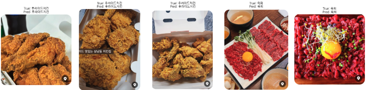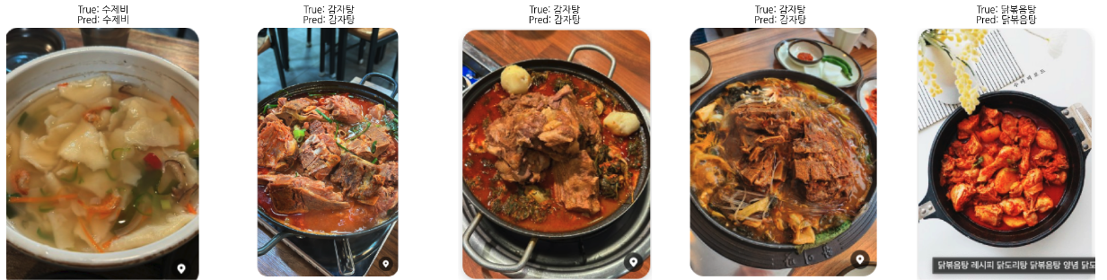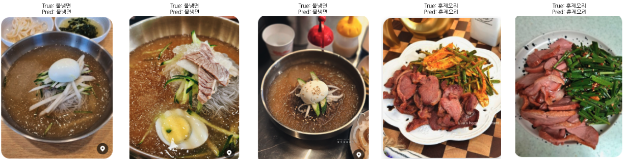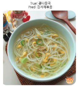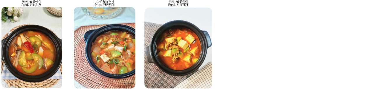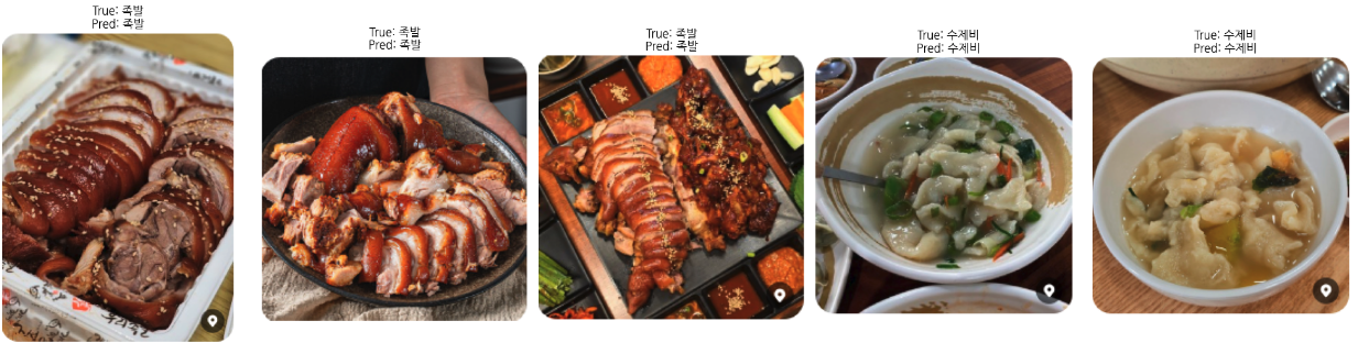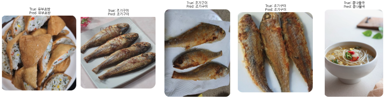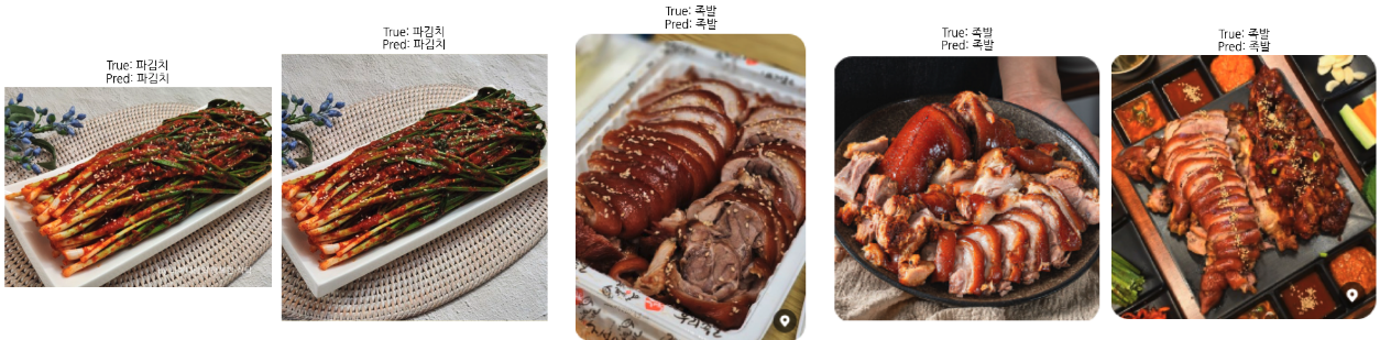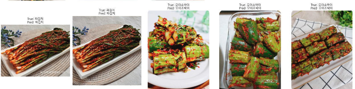 직접 수집한 11개의 소분류 음식 사진을 대상으로 예측을 진행했을 때 사진7를 통해 33개의 테스트 이미지에서 9개의 이미지를 예측하는데 실패한 것을 확인할 수 있다. 즉, 정확도는 72.73%이라고 볼 수 있다.