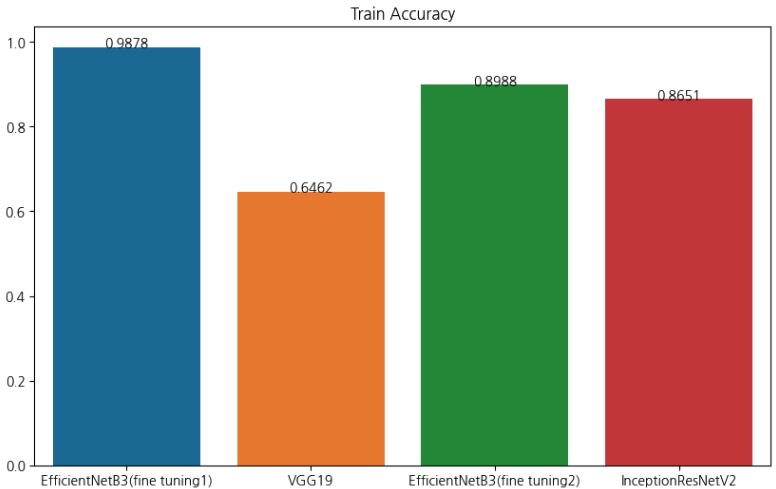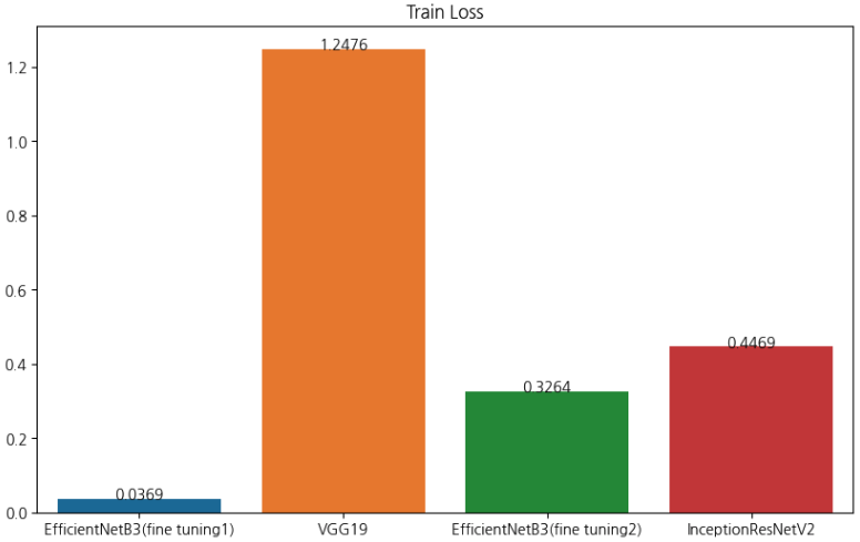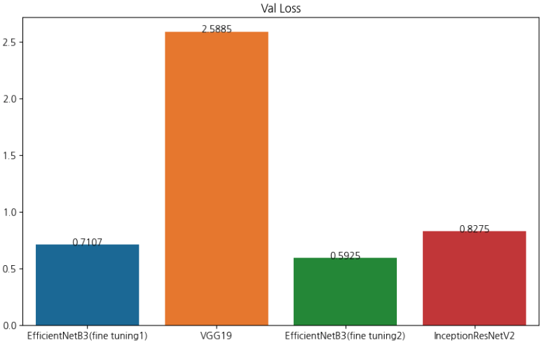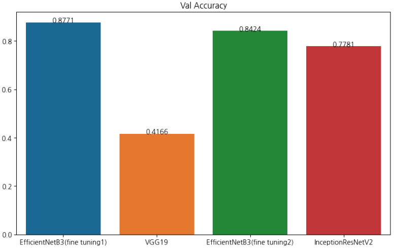 가장 좋은 성능을 보여준 모델은 EfficientNetB3이다. EfficientNetB3 모델을 이용해 두 개의 버전으로 나누어 학습을 진행했다. 그 중 가장 좋은 성능을 보여준 것은 두 번째 버전으로 미세 조정을 위해 앞 50개의 층을 동결한 후 각 소분류 마다 validation 비율 0.02%, batch size: 32, BatchNormalization층의 경우 동결을 하고 학습을 진행했다. 결과적으로 train-accuracy: 0.8988, train-loss: 0.3264, validation-accuracy: 0.8424, validation-loss: 0.5925의 결과가 나왔다.