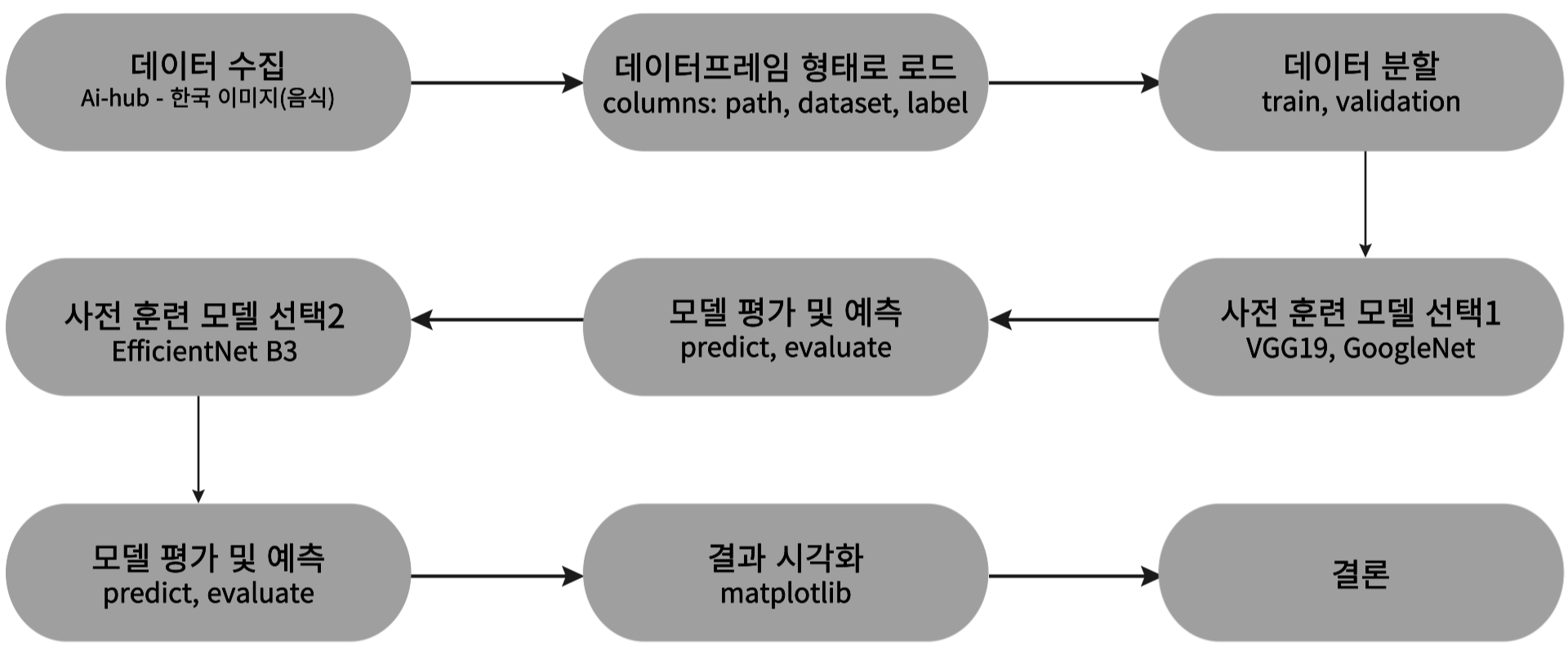 프로젝트 진행 과정에서 데이터셋의 대량 이미지 수집은 큰 어려움이 없었으나, 이미지 전처리 과정에서 일부 유효하지 않은 이미지를 제거해야 했기 때문에 오랜 시간이 걸렸다. 결과적으로 총 142,642개의 한식 이미지를 학습에 이용했다.
