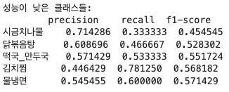 앞의 결과를 통해 EfficientNetB3의 미세 조정2가 가장 좋은 성능을 보여주었다. 이전 모델을 진행하면서 미세 조정뿐만 아니라 train, validation size, batch size 등에 대한 정보를 축적하면서 진행했었기에 좋은 성능을 가진 모델을 만들 수 있었다고 판단하고 있다. 하지만 아쉬운 점은 앞에서 봤던 사진10과 같이 성능이 낮은 클래스들에서는 낮은 f1-score를 보여준다. 이 부분에 대해서는 추후 정규화와 데이터 증강 기법을 적용해 보완하고자 한다.