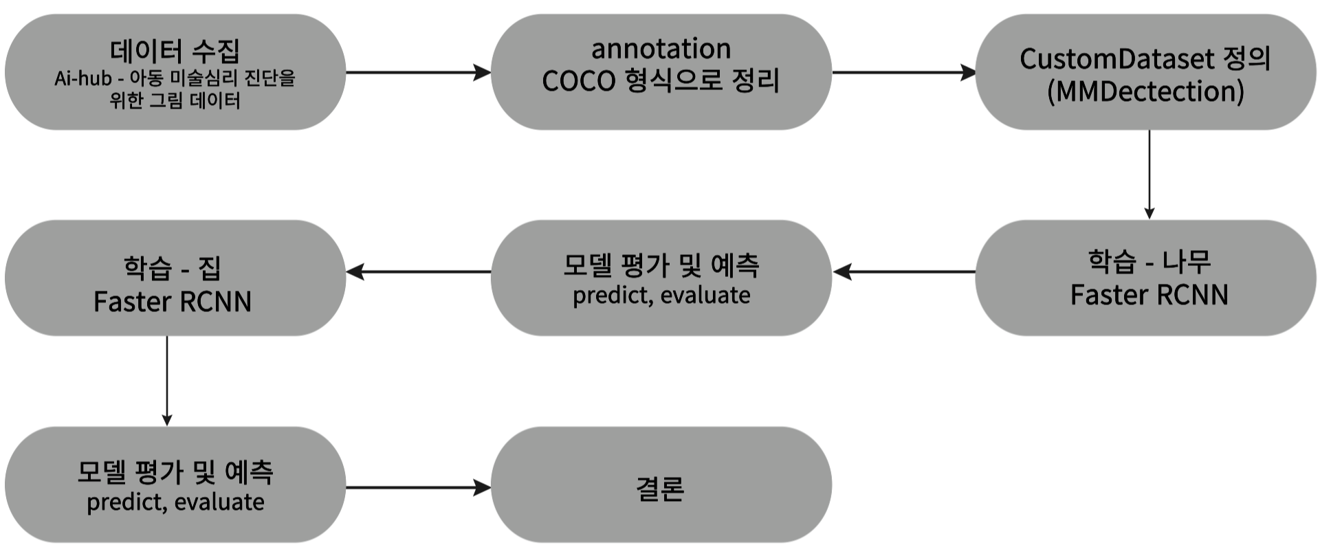 Faster R-CNN은 정확도는 높지만 학습 속도가 느려 '아동 미술심리 진단을 위한 그림' 데이터셋에서 총 4개 카테고리인 나무, 남자사람, 여자사람, 집에서 나무, 집을 대상으로 학습을 진행했다. 뿐만 아니라 미술심리 진단을 위한 그림을 그릴 때 나무, 집, 남자사람, 여자사람을 한 장에 전부를 그리는 것아닌, 각각 따로 그리기 때문에 나무, 집을 같이 학습한 것이 아닌 따로 학습을 진행해 최종적으로 두 개의 모델을 만들었다.