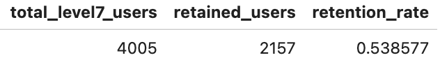 즉, 이벤트 미션인 레벨 7에 도달한 일부 유저는 게임을 떠나고, 나머지는 게임을 지속하며 더욱 높은 Retention 비율을 유지하는 걸로 볼 수 있다.
