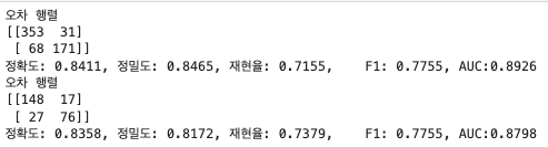정확도: 0.8172, 정밀도: 0.8293, 재현율: 0.6602, F1: 0.7351, AUC:0.8850