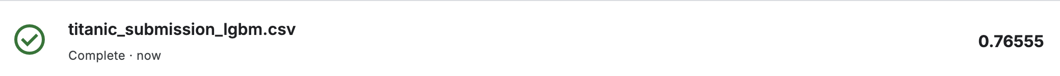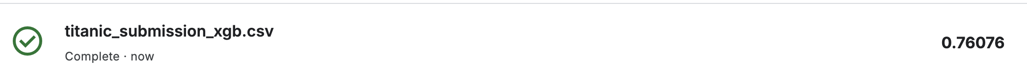 randomforest와 다르게 Sex와 Pclass 보다 Age_range가 중요하게 작용한 것을 확인할 수 있다. F1 score가 조금 더 높게 나왔지만kaggle에 제출했을 때 다음과 같은 점수를 얻을 수 있다. 오히려 randomforest로 학습했을 때 보다 더 낮게 나왔다.