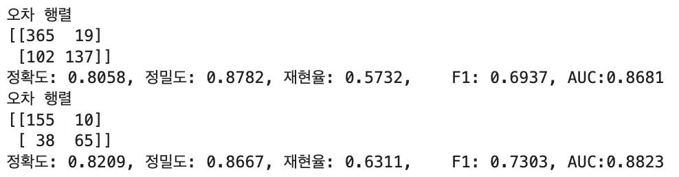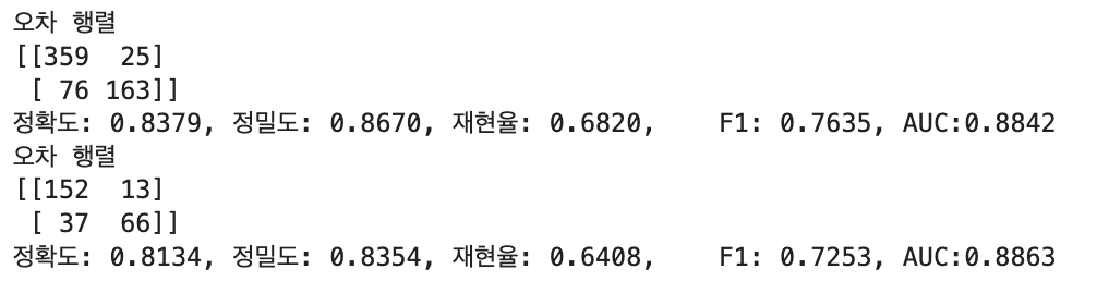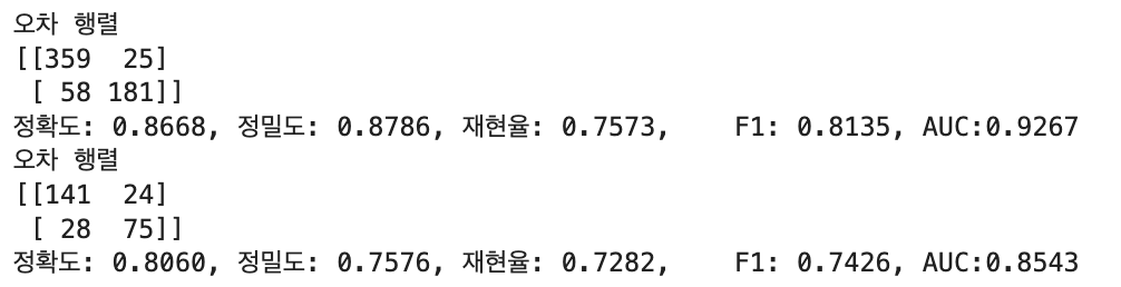 위에가 train data, 아래가 test_data로 예측했을 때의 결과이다. 과적합이 된 것을 확인할 수 있다. 뿐만 아니라 오차행렬을 통해 False Positive, False Negative 역시 높게 나온 것을 확인할 수 있다. 즉, 점수는 높지만 예측을 제대로 하지 못 하고 있다는 것이다. 이제 하이퍼파라미터를 튜닝해 보겠다.