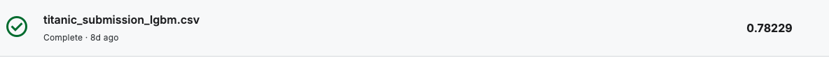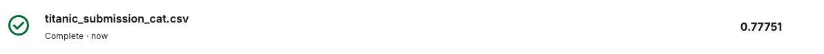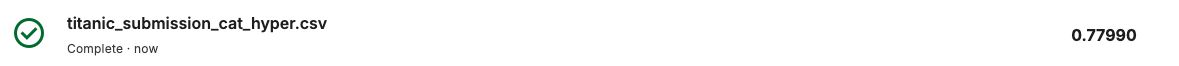 다음과 같이 결과를 확인할 수 있으며 kaggle에 제출하면 0.77990으로 randomforest와 같은 점수를 받을 수 있다.