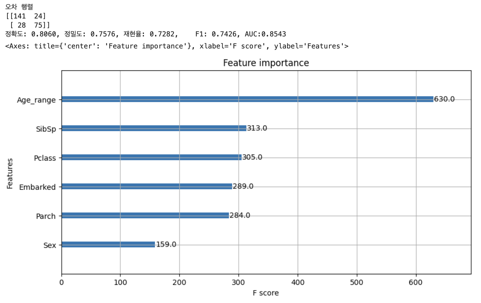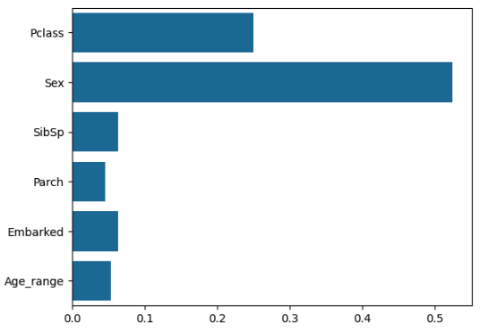 다음과 같은 결과가 나온다. 하이퍼파라미터는 모델 학습 과정에서 사용자가 직접 설정해야 하는 파라미터로, 모델의 성능에 큰 영향을 미친다. 이 때 그리드서치를 사용하면 사용자가 설정한 하이퍼파라미터 값들의 가능한 모든 조합을 탐색하여 가장 좋은 성능을 내는 조합을 찾을 수 있도록 도와준다. 따라서 결과로 최적의 하이퍼파라미터 값이 나오고 그 값을 토대로 훈련을 했을 때 feature importance를 확인해 볼 수 있다. 그리드서치를 이용한 모델은 Sex, Pclass를 중요한 특성으로 사용했다.